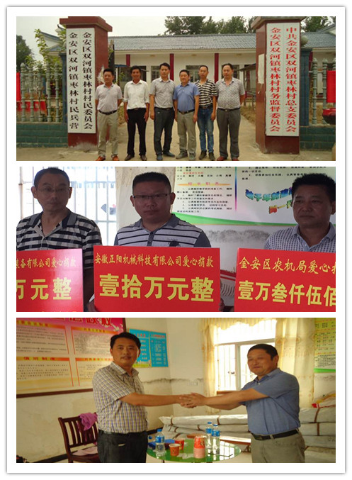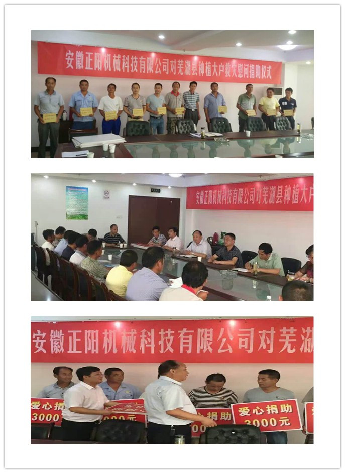 同時我公司針對今年長江中下游、江淮區(qū)域發(fā)生的嚴(yán)重的洪澇災(zāi)害勇于擔(dān)當(dāng),注重快速發(fā)展自身的同時更高度重視企業(yè)社會責(zé)任,本著以回報社會為己任;企業(yè)利潤來之于民、用之于民;義利兼顧的宗旨,安徽正陽機(jī)械科技有限公司總經(jīng)理張為法于2016年7月13日下午前往“正陽”糧食烘干機(jī)主銷區(qū)域安徽蕪湖、六安、湖北孝感等受災(zāi)嚴(yán)重地區(qū)捐贈現(xiàn)金數(shù)十萬元,幫助災(zāi)區(qū)人民萬眾一心共抗洪災(zāi),盡快恢復(fù)生產(chǎn),讓受災(zāi)群眾真實感受到黨和政府的溫暖、民營企業(yè)家的責(zé)任,公司以正能量品牌的形象和風(fēng)范履行了自身應(yīng)盡的社會責(zé)任。